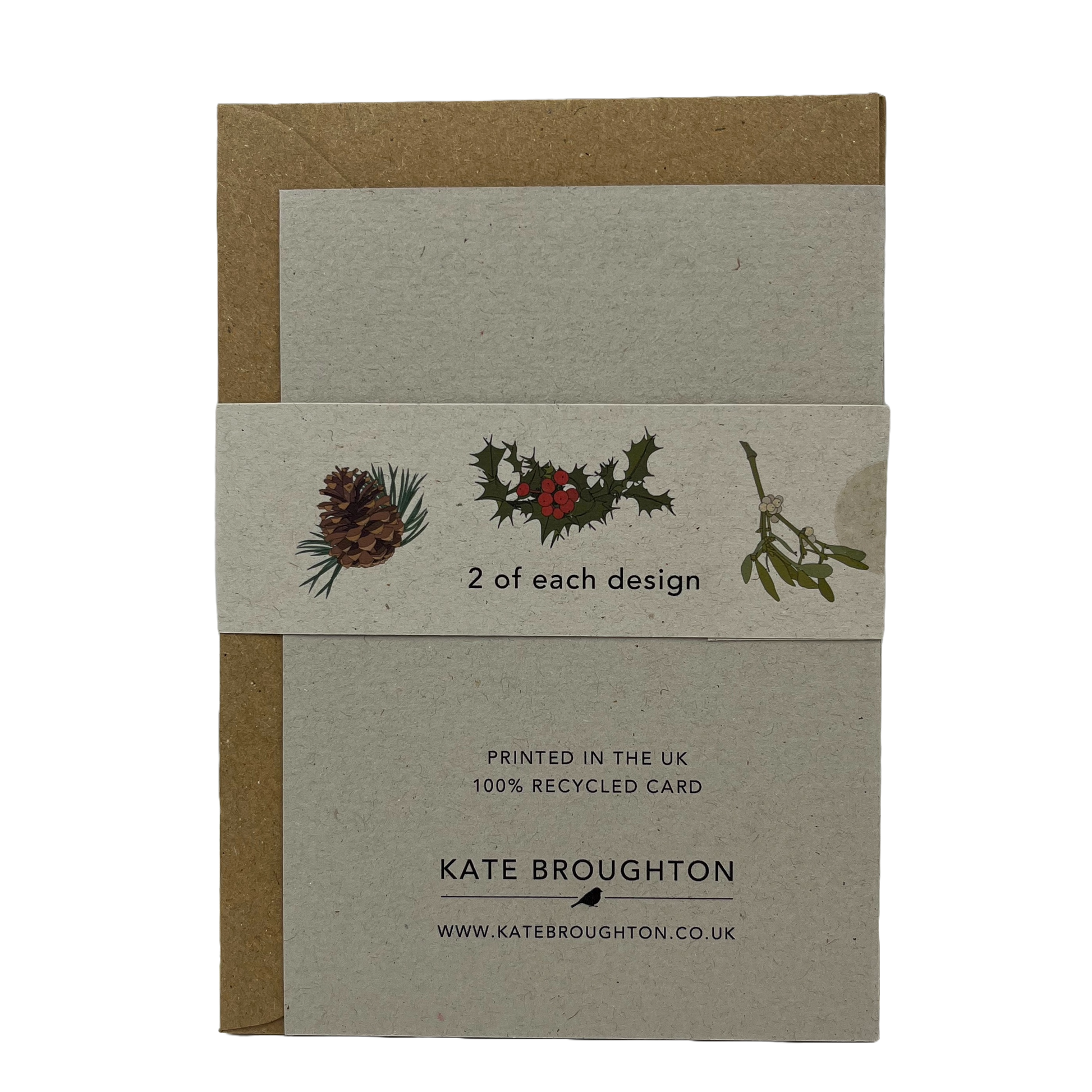 This beautifully designed set of 6 cards features 2x holly leaves, 2x pine cones, and 2x mistletoe designs.