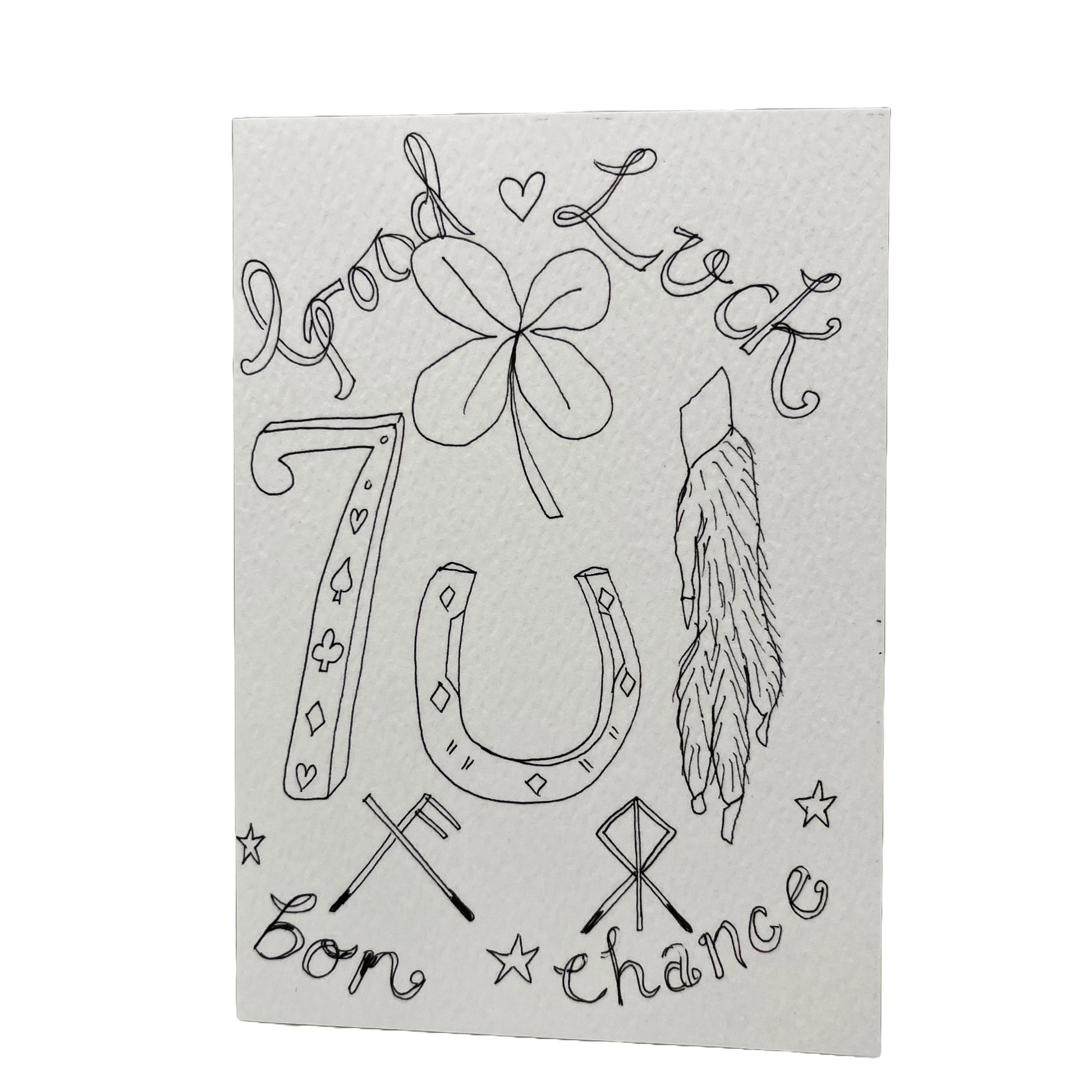 This beautifully designed card features black outlining of lucky symbols and text saying 'Good Luck bon chance'.