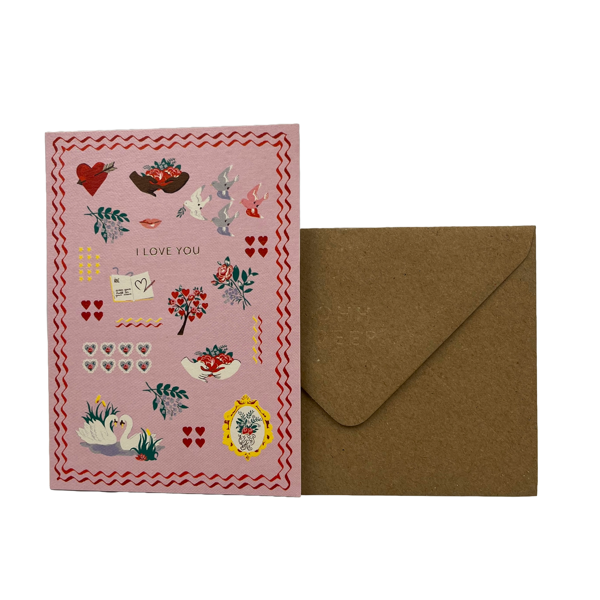 This beautifully designed card features text saying 'I Love You' on a pink background with love themed designs. The intricate design provides a fun and sophisticated look.