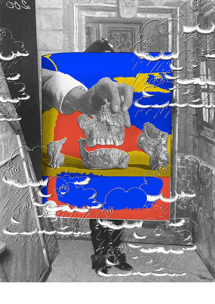 Duncan Poulton's 'Many Happy Days' (2022) reflects on the last few years when our collective days have been filled with the bleakness that comes with facing our own mortality. This digital collage, in which archaeological textbook photographs and smiling cartoon rainclouds are compressed, reminds us that contradictions, like fear and apathy, coexist and come and go as the days pass, unrelenting.