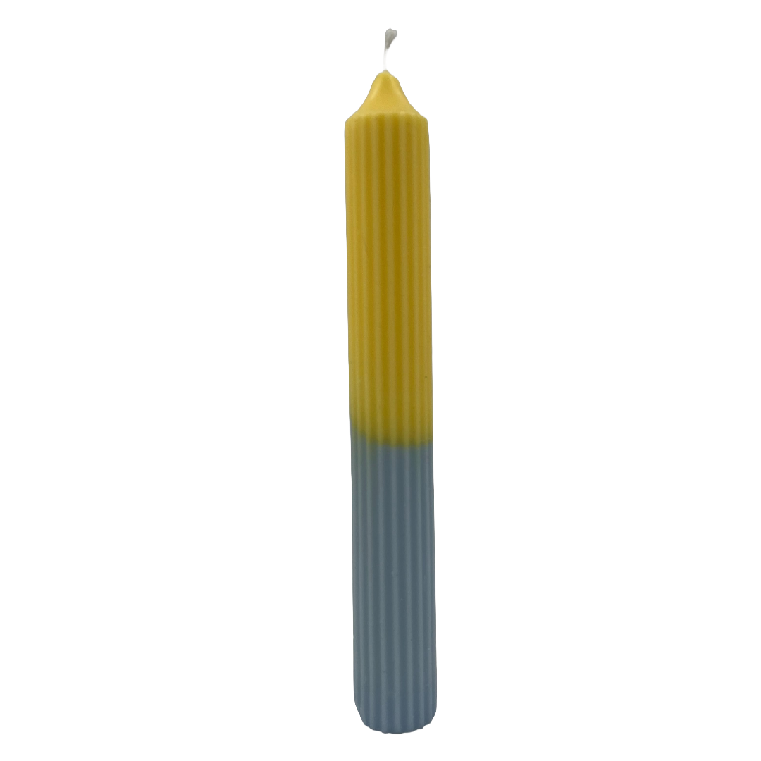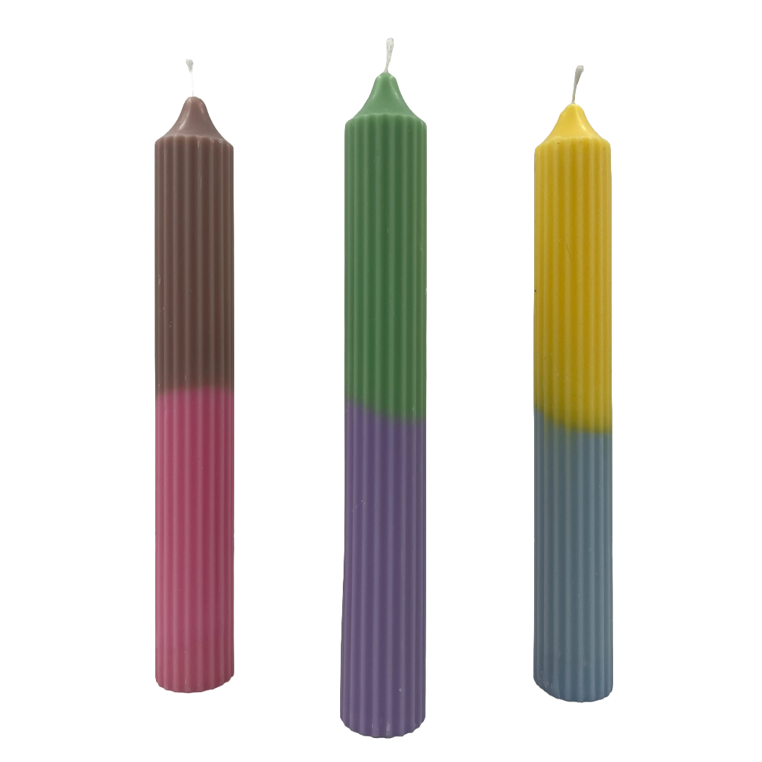 Our two-toned ribbed pillar candles are lovingly hand-poured in West London using vegan wax, featuring beautiful pastel colors. Each unique candle makes a perfect gift for birthdays, housewarmings, or simply adding a stylish touch to your home.